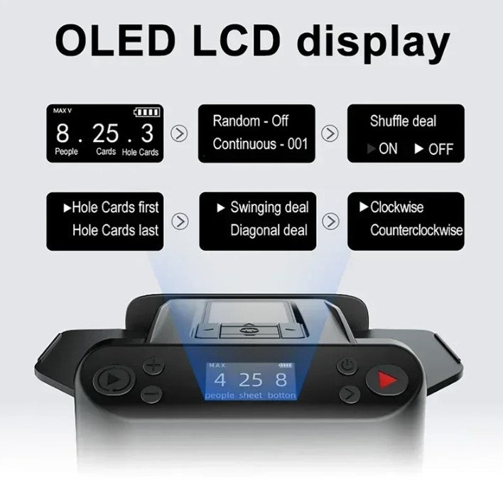 A bright OLED LCD makes it simple to control every feature — from language settings (English/Chinese) to player count, dealing speed, and even card distance. Play your way with custom settings for up to 12 players and 2 decks — perfect for poker nights, family gatherings, or tournaments.